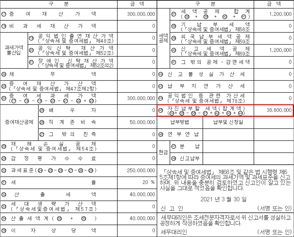 3억 현금 혹은 아파트 증여시 얼마의 세금을 내야하는지 알아보는 분들이 있을 것입니다. 위와 같이 자진납부할 세액은 38,800,000원 입니다.