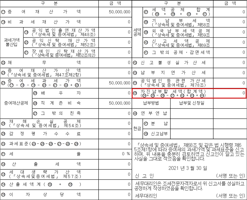 하지만 1억원 이상의 현금이 오고 갈 경우, 부모자녀간 이라고 할지라도 증여세를 반드시 확인해야 합니다. 증여재산 공제는 직계 존비속 5천만원, 산출세액은 500만원, 신고세액공제는 15만원 입니다. 납부할 세액은 총 4,850,000원 입니다.
